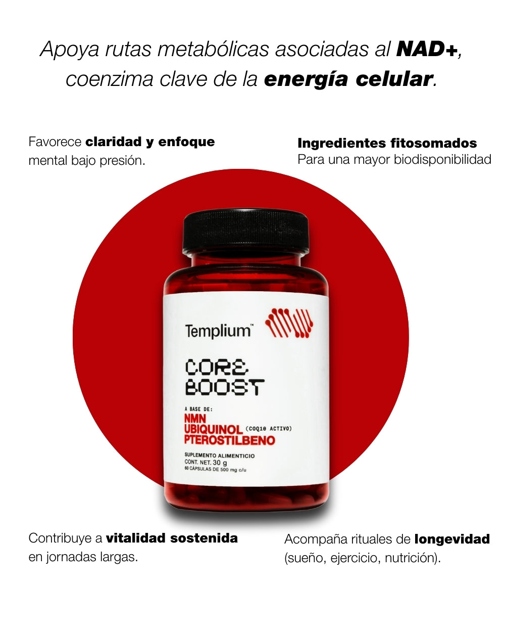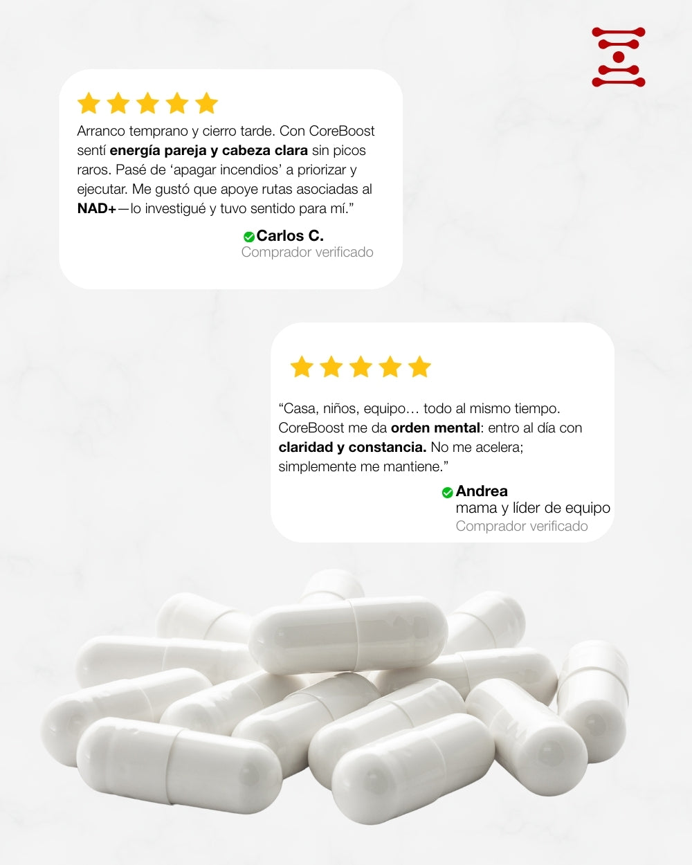 Core Boost no es un estimulante temporal como el café. Es un reinicio fundamental para tus motores celulares. Su fórmula avanzada trabaja a nivel mitocondrial para recargar la producción de energía desde su origen, devolviéndote la vitalidad y resistencia de tu mejor versión.
